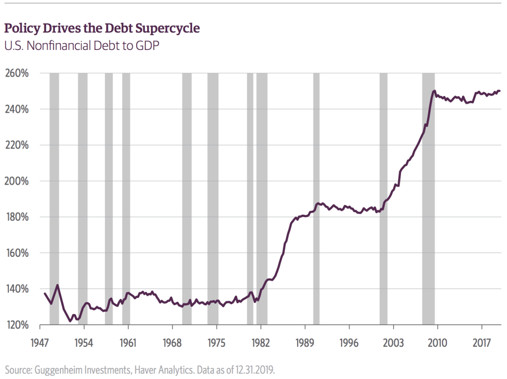 The policy of the central bank to continually step in, lower interest rates, and encourage companies and people to take on more debt has been in place since the 1930s. The idea that the central bank could push interest rates down and make more credit available to smooth out the business cycle is designed to have an economy that operates with fewer recessions, less severe recessions, and ultimately longer periods of expansion. This policy worked, but it also created the Great Debt Supercycle: Every time we get ourselves in a recession, the total debt of the U.S. economy rises relative to gross domestic product (GDP) to new and higher levels. This is not sustainable in the long run, even if we are able to push interest rates into significantly negative positions on a sustained basis.