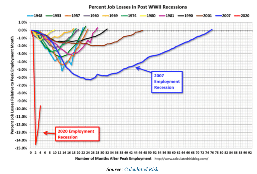 …You can see in the 2007 line how long it took employment to recover after the last recession. At that pace, all the jobs will be back sometime in 2026 (Not a typo.) To assume the “V” seen above will continue in the same direction means thinking there will be a quick return to normalcy.