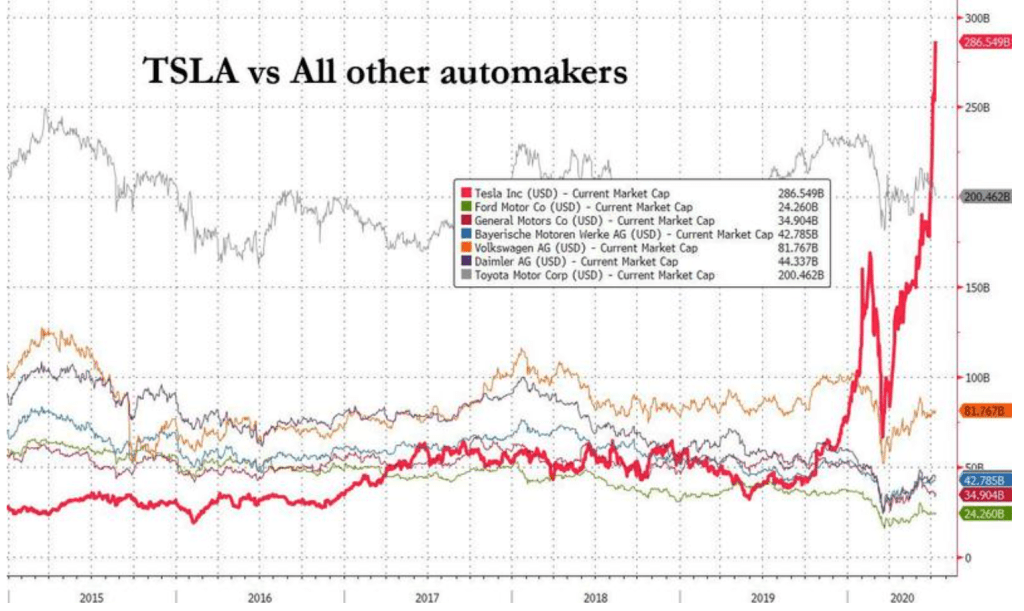 While so far Novogratz’ warnings have fallen on deaf ears, with Robinhooders clearly chasing momentum in such mega-bubble stocks as Tesla…whose market cap is now greater than that of Ford + GM +BMW + Daimler + Volkswagen combined…the man who made a killing buying bitcoin and ethereum ahead of the heard, said that the surge in equities, especiallly tech stocks, reminds him of the rally in Bitcoin prices in 2017, when the cryptocurrency went from $8,000 to almost $20,000 within a couple months due to retail interest…before crashing just as fast. It now trades at roughly half the price it reached during the December 2017 peak.